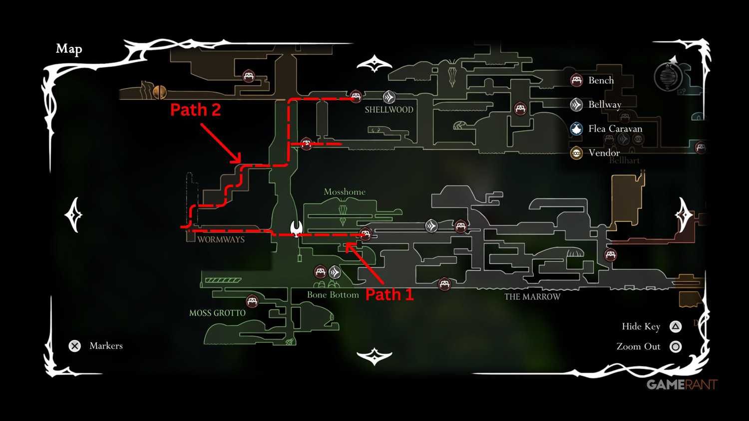 - From The Marrow: If you haven’t unlocked the Bone Bottom elevator, you will need to go through The Marrow. From a bench in this area, head left across the platforms. Use your Swift Step to cross a gap and proceed through the exit on the right. This will lead you to the signpost area where you can then follow the steps above to reach the Wormways entrance.