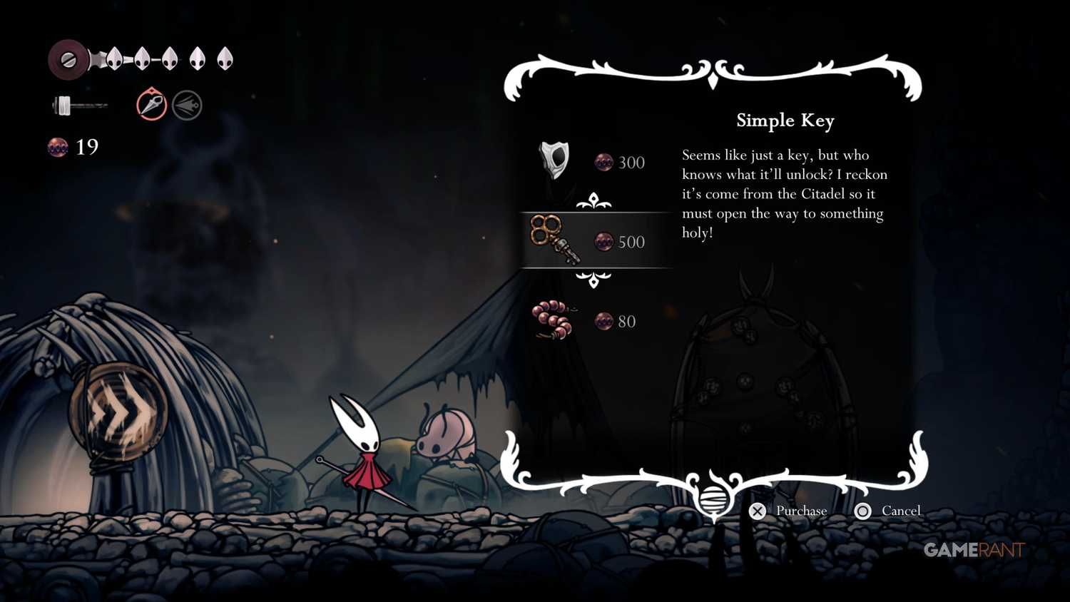 - The Simple Key: This is a mandatory item for unlocking the door to the Wormways. The first Simple Key you’ll encounter is sold by the trader Pebb in the village of Bone Bottom for 500 Rosaries. If you are short on funds, a great early-game farming spot is in the Mosshome area, near the bench where you first find the map-maker Shakra.